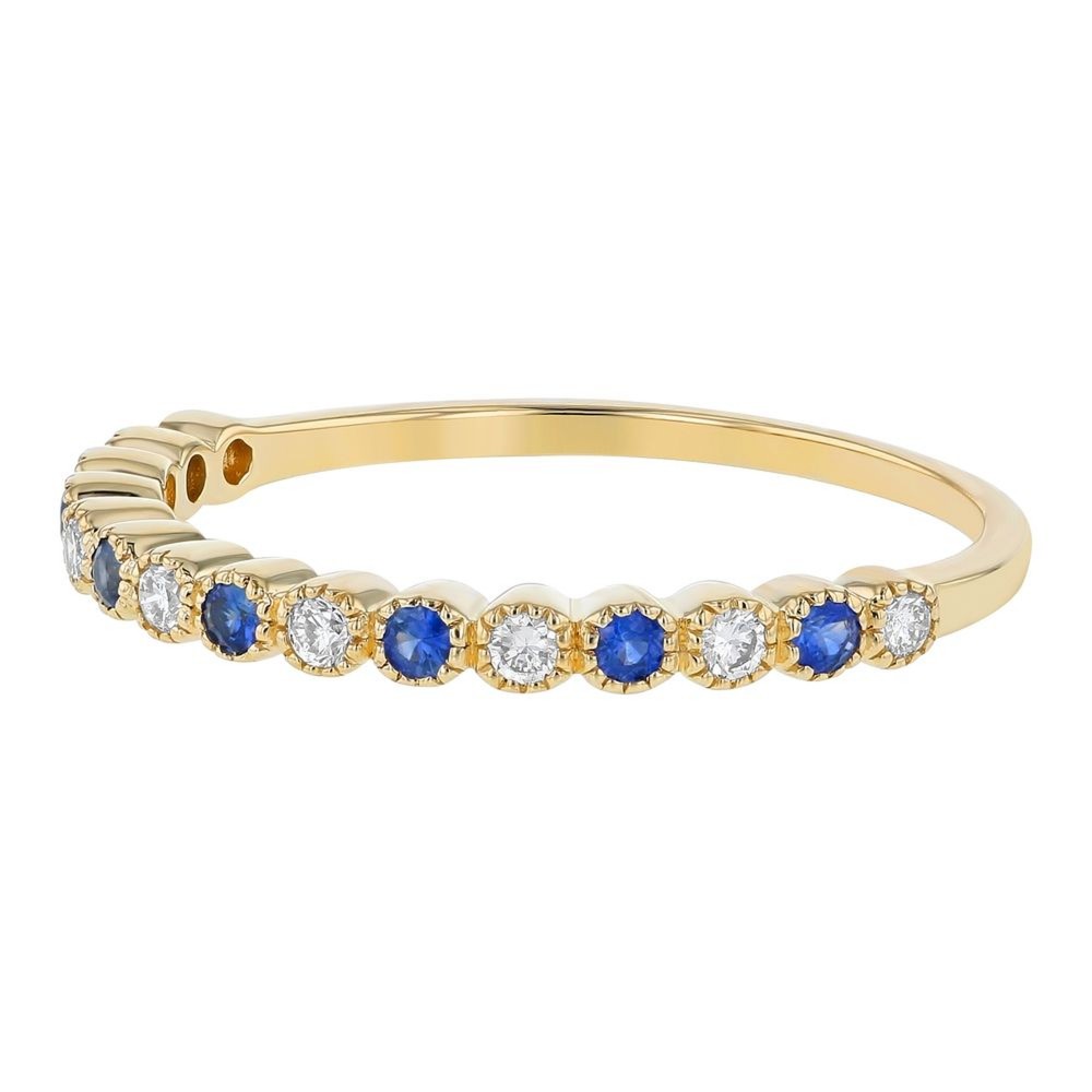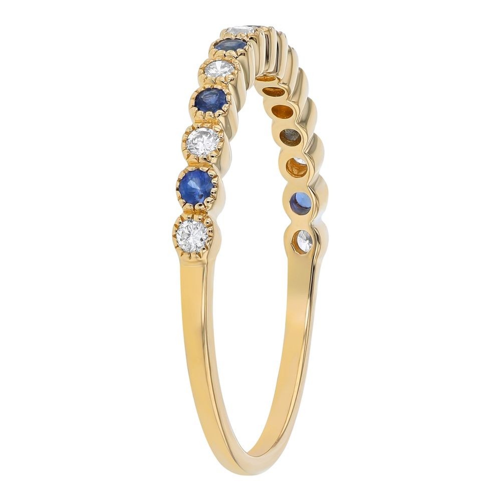 14K yellow gold band ring set with 0.10 ct. round blue sapphires and 0.13 ct. round brilliant diamonds. Sapphires are natural, heat treated.