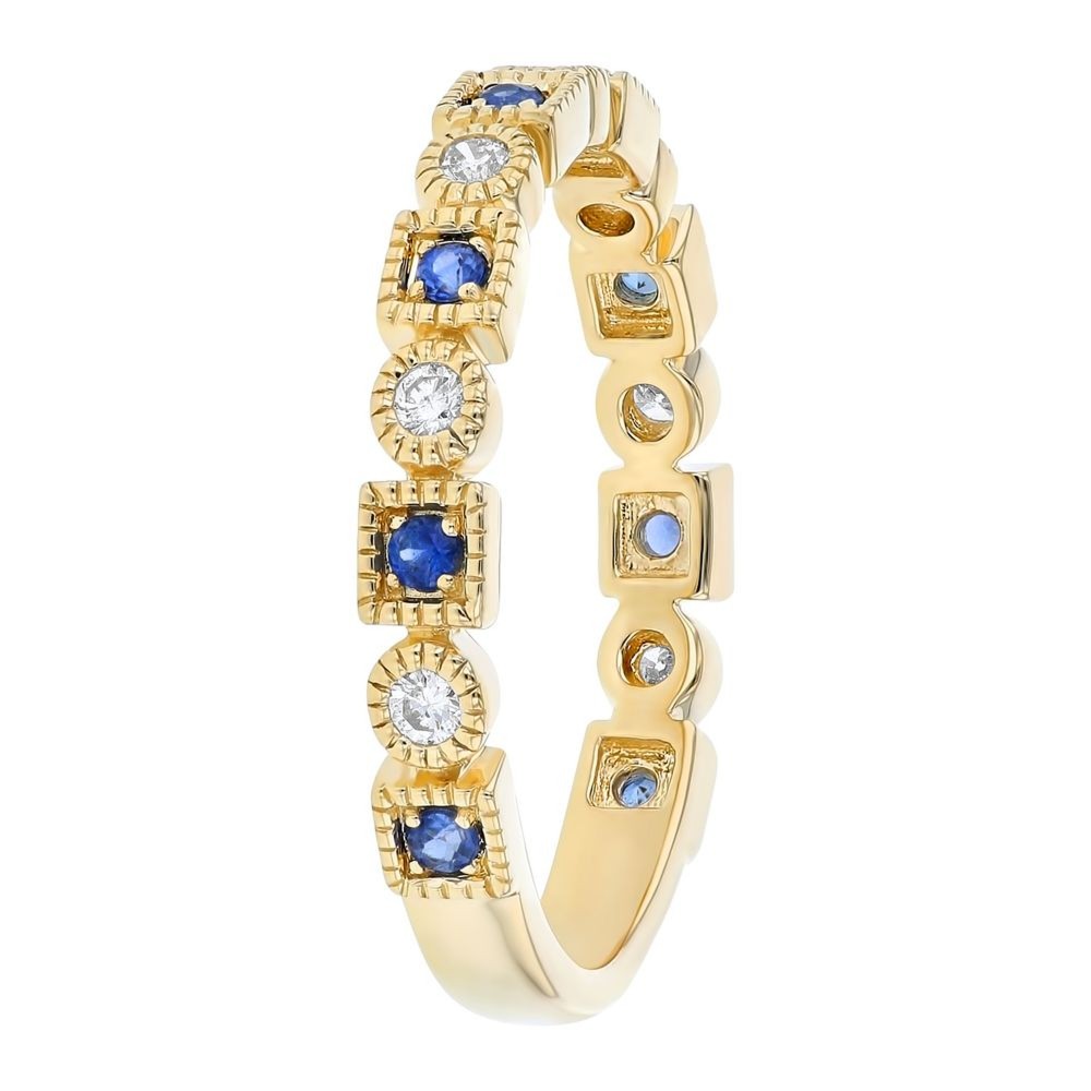 14K yellow gold band ring set with 0.10 ct. round blue sapphires and 0.13 ct. round brilliant diamonds. Sapphires are natural, heat treated.