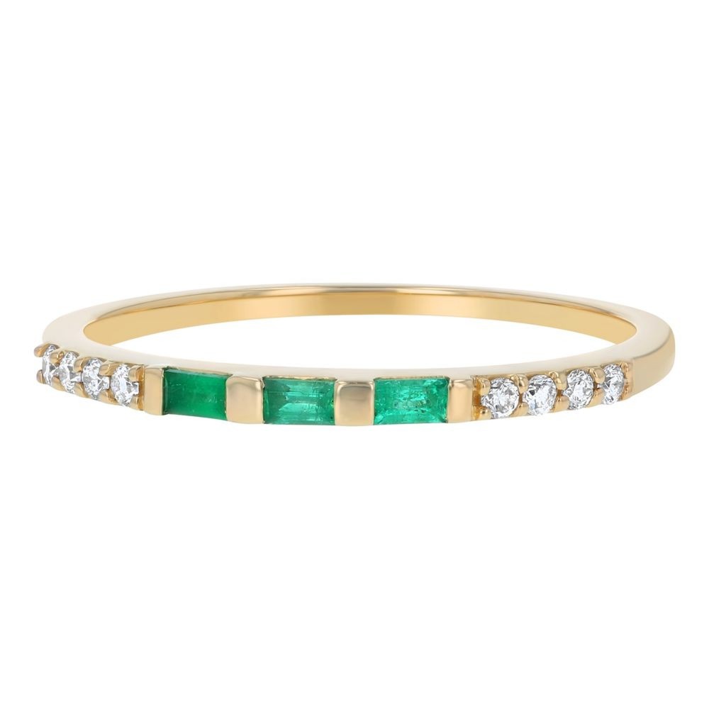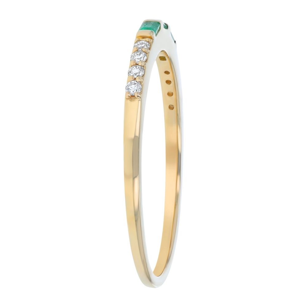 14K yellow gold band ring set with 0.10 ct. baguette emeralds and 0.08 ct. round brilliant diamonds.