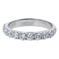 14K white gold semi eternity wedding band ring shared prongs set with 1.00 ct. round cut brilliant white diamonds, side and shank engraved and high polish finish.