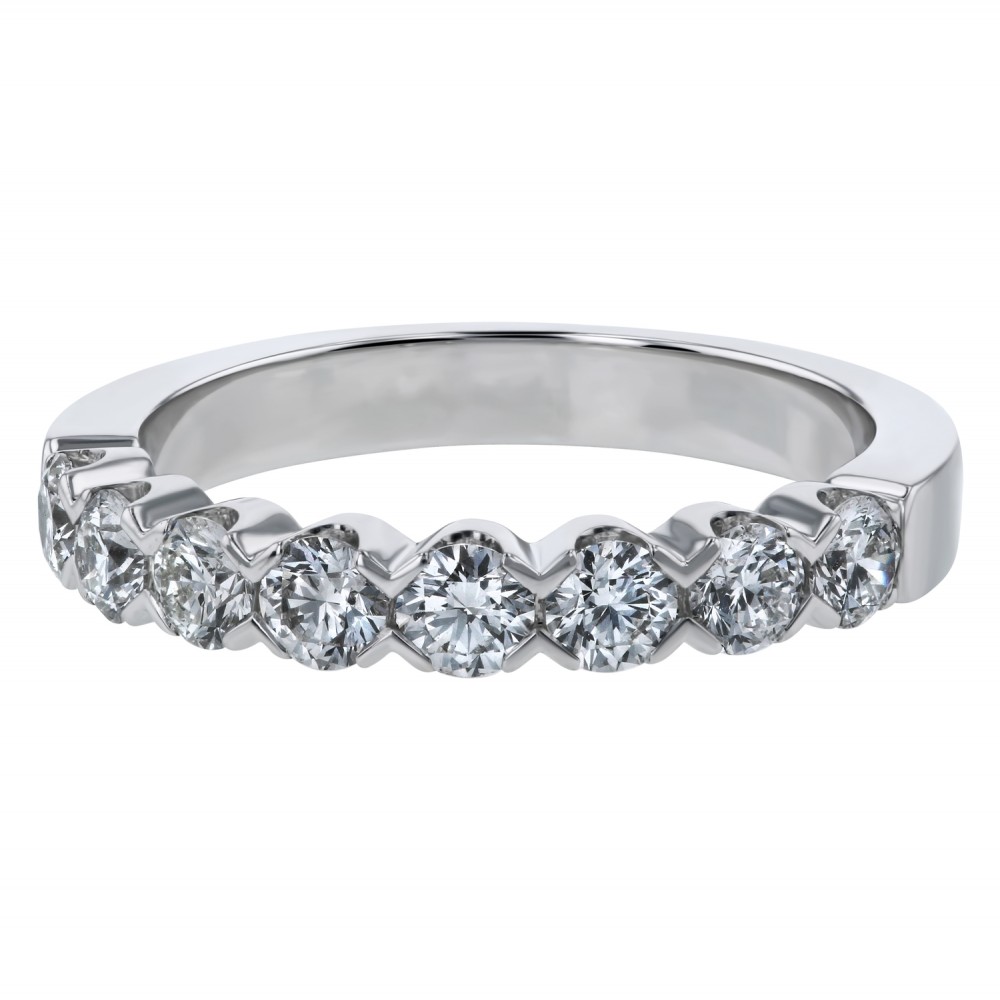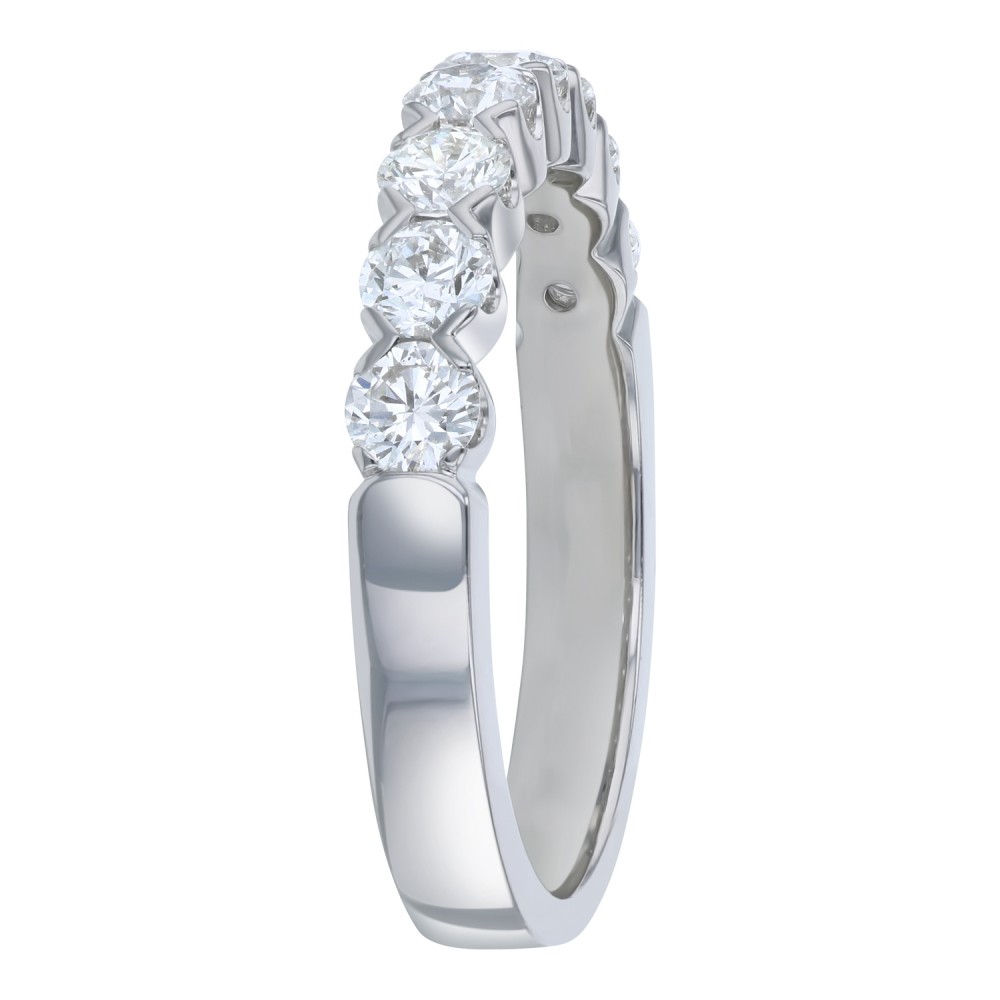 14K white gold semi eternity wedding band ring shared prongs set with 1.00 ct. round cut brilliant white diamonds and high polish finish.